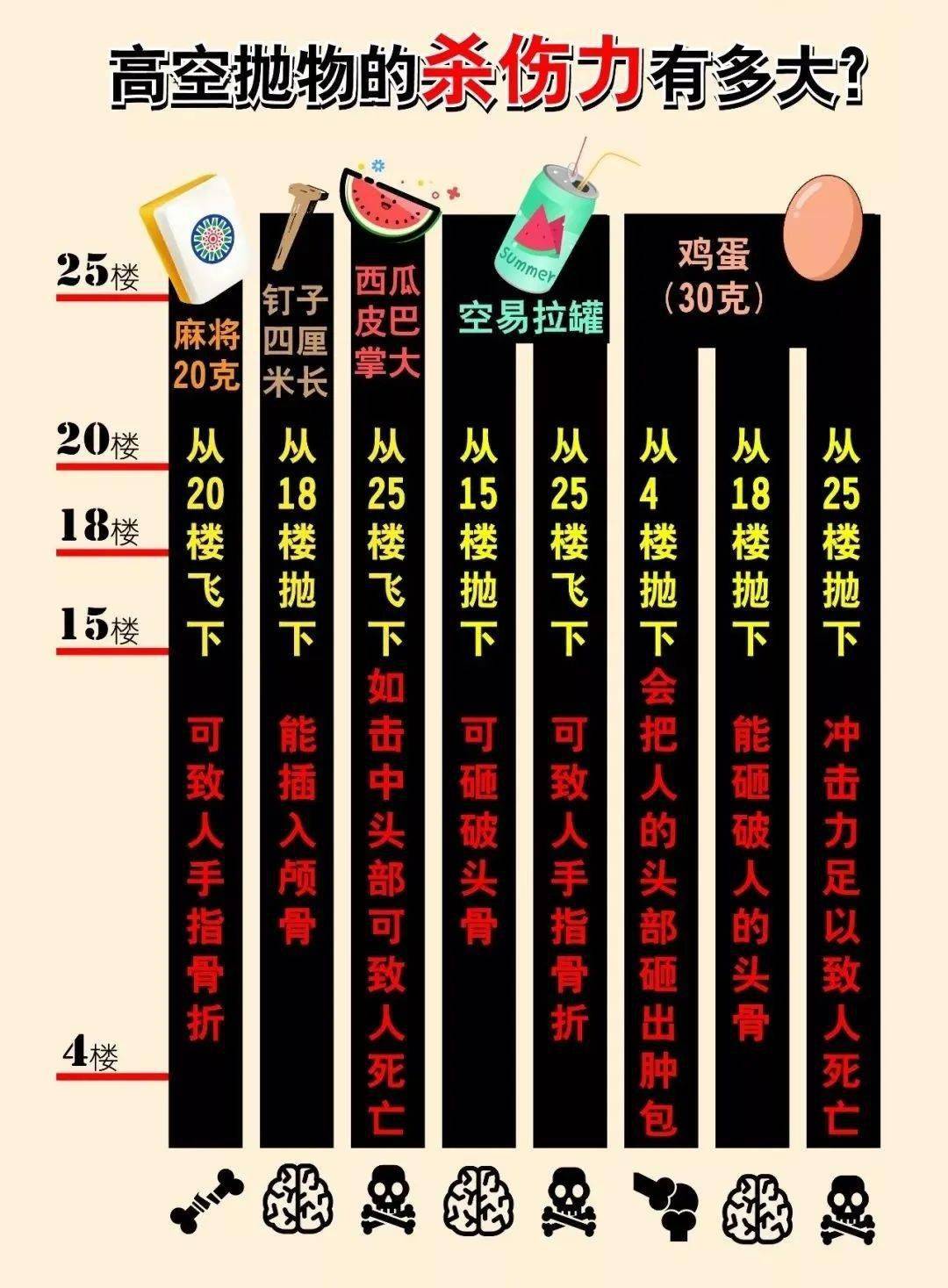 近年來,全國各地陸續(xù)發(fā)生高空拋物、墜物傷人事件,成為“城市上空之痛”。高空拋物的危害有多大?4厘米的鐵釘從18樓拋下能插入顱骨;空易拉罐從25樓拋下可致人手指骨折;巴掌大的西瓜皮從25樓飛下如擊中頭部也能要人命。