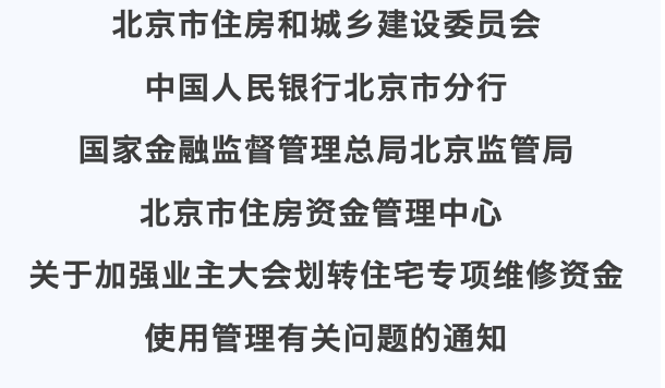 近日市住房城鄉(xiāng)建設(shè)委、中國人民銀行北京市分行、國家金融監(jiān)督管理總局北京監(jiān)管局、市住房資金管理中心等四部門,聯(lián)合下發(fā)《關(guān)于加強(qiáng)業(yè)主大會劃轉(zhuǎn)住宅專項(xiàng)維修資金使用管理有關(guān)問題的通知》,就維修資金劃轉(zhuǎn)后使用管理工作提出明確要求: